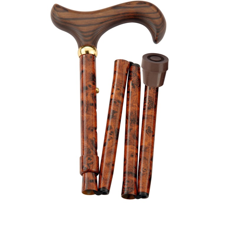 Flot foldestok fremstillet i aluminium med hårdttræ derby håndtag. Flot træ effekt på stokken med fint satin finish lak.
